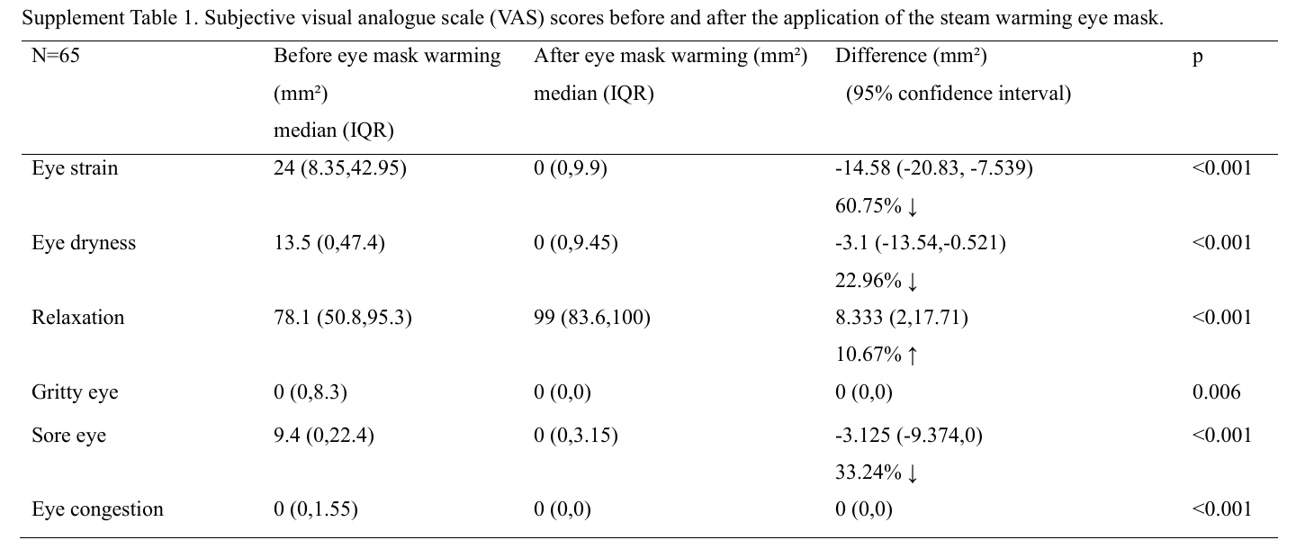 视觉功能方面也出现了积极变化。使用花王美舒律儿童蒸汽眼罩热敷前后的即时变化为:儿童眼部调节幅度显著增加,平均差值为1.00D,表明相对改善了13.9%。此外,干涩得到即时缓解。裸眼远视力(换算为LogMAR)也有即时改善(中位数从0.15降到0.1)。不过,屈光度和眼轴长度等结构性指标未见可测变化。这说明,蒸汽眼罩热敷即时改善的主要是眼睛的调节幅度和舒服度,没有改变眼睛本身的结构。