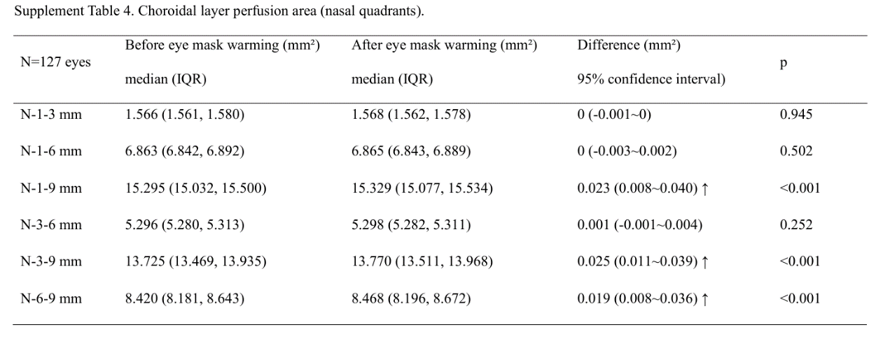 脉络膜是位于视网膜后方、富含血管的组织,负责为视网膜(尤其是感光细胞)提供营养和氧气,其血流状况被视为近视进展的潜在生物标志物。研究显示,使用花王美舒律儿童蒸汽眼罩后,距黄斑中心3-6毫米、6-9毫米范围内的脉络膜血流灌注面积即时显著增加,尤其在鼻侧区域(如N-1—9 mm、N-3—9 mm),增幅达0.019至0.025 mm²(p<0.001)。